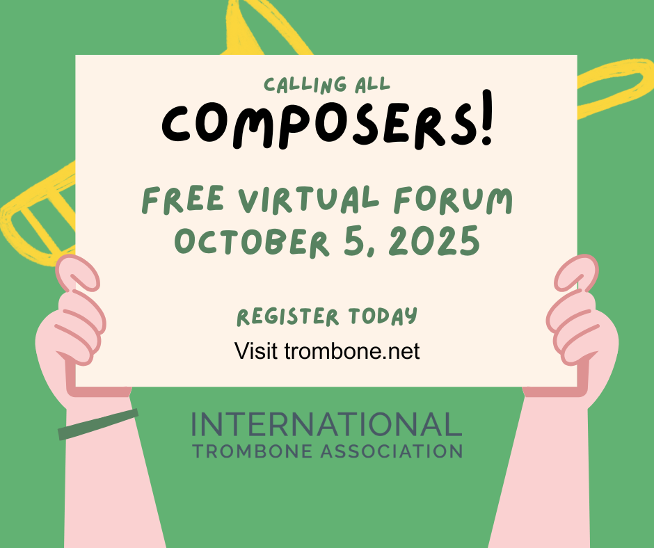 Calling All Composers: The International Trombone Association Composition Competition (ITACC) is offering composers free access to an important event! The ITACC Virtual Forum will take place on Sunday, October 5, 2025, from 3:00–4:00 PM Eastern Standard Time (15:00-16:00 Central European Time). Step behind the curtain and hear directly from our world-renowned panel of judges as they share what...