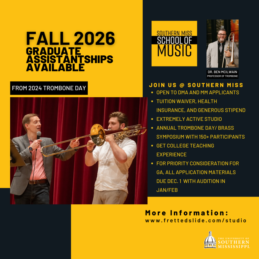 The University of Southern Mississippi Trombone Studio has openings for MM and DMA applicants with graduate assistantship funding opportunities. The Trombone Graduate Assistantship includes teaching music major lessons and assisting with trombone ensembles, among other duties.
